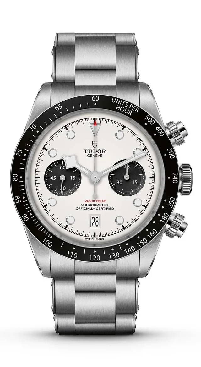 Beim Design gibt es viele Parallelen: Beide Marken bieten den Chrono mit Zifferblättern in Schwarz und Weiß an, die Hilfszifferblätter sind symmetrisch angeordnet und farblich abgesetzt. Beim mit 41 Millimetern minimal größeren Gehäuse sorgen verschraubte Drücker und eine schwarze Lünette (bei Tudor aus weicherem Aluminium) mit Tachymeterskala für Ähnlichkeit, und das dreiteilige Stahlband kommt dem Design des Oysterbands sehr nahe. Größte Unterschiede neben Zeigern und Indexen sind der Verzicht auf den Stundenzähler und die Ergänzung eines Datums. Funktional kann die kleine Schwester eine mit 200 Metern doppelt so hohe Wasserdichtheit aufweisen. Ist der Black Bay Chrono die bessere Daytona? Natürlich nicht, und es gibt auch Unterschiede bei der Verarbeitungsqualität. Aber Tudor bietet ein gelungenes Design, ein ausgezeichnetes Werk, funktionale Vorteile und ein deutlich besseres Preis-Leistungs-Verhältnis.