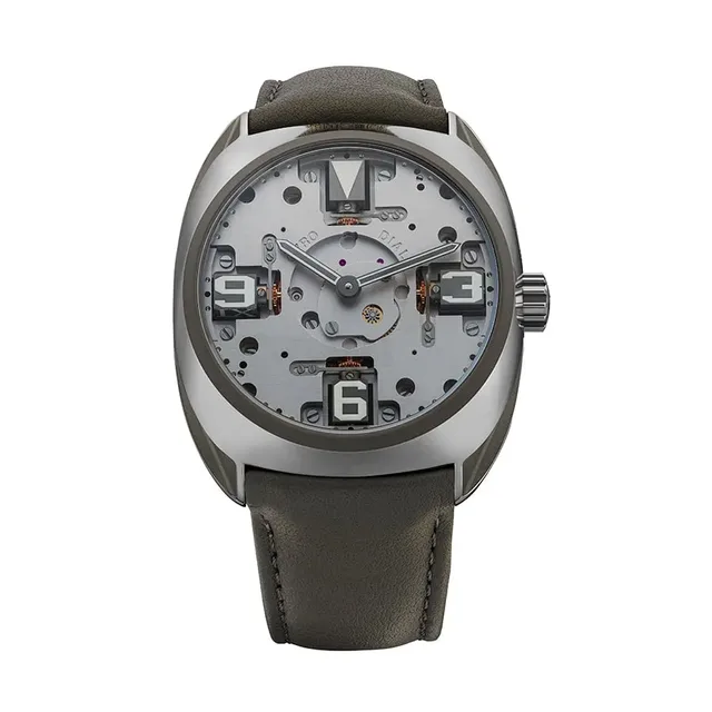 Die GyroDial Zero bietet dem Träger die volle Sicht auf den besonderen Mechanismus. Die Komponenten des Uhrwerks werden in verschiedenen Grautönen enthüllt. Brücken, Schrauben, Platine und Kardinalmarker sind in Rhodium Silber oder Rhodium Schwarz ausgeführt.