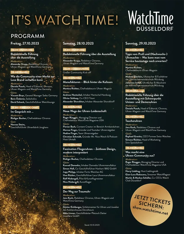 Bei der WatchTime Düsseldorf, die vom 27. bis 29. Oktober 2023 in der Rheinterrasse Düsseldorf stattfindet, erwarten Sie nicht nur rund 40 Uhrenmarken, sondern auch ein spannendes Rahmenprogramm. Bei Panel-Diskussionen und Community-Treffen erfahren Sie mehr über wichtige, aktuelle Themen rund um mechanische Uhren. Nachfolgend finden Sie einen Überblick über das Programm powered by Chronos, Uhren-Magazin und WatchTime:WatchTime Düsseldorf 2023 – Tag 1: Freitag, 27.10.2023