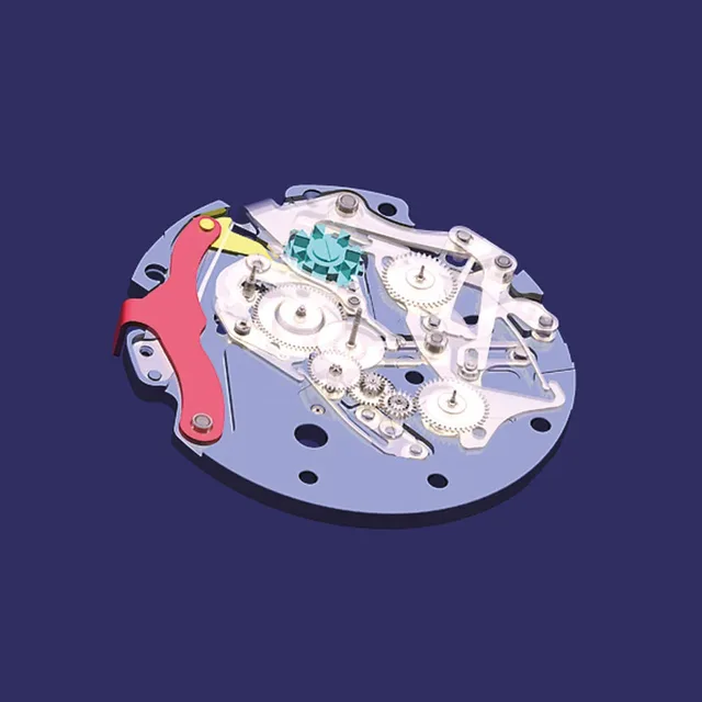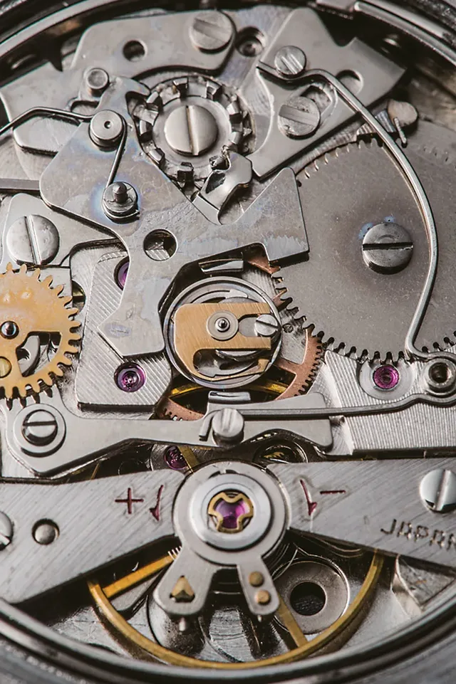 Durch den Glasboden sieht man das Kalibers 6139 und die Schwungmasse des automatischen Aufzugs. Eine einfache Wartung war ein wesentliches Merkmal der Serie 61. Allein durch Lösen der Schraube in der Mitte konnte der Rotor entnommen, die beiden Drücker konnten gemeinsam mit dem mittleren Gehäuse abgenommen werden.Toshihiko Ohki von Suwa Seikosha (heute Seiko Epson), der 1964 den „Crown Chronograph“ mit Handaufzug entwickelt hatte, erhielt die Verantwortung für die Entwicklung des neuen Chronographen. Das von ihm entwickelte Automatikkaliber der Serie 61 wurde als Basiskaliber bei der „61 5 Sports“ eingesetzt und wurde ein riesiger Erfolg. Davon ermutigt nahm Ohki die Entwicklung des Automatikchronographen in Angriff.Zur damaligen Zeit verwendete Suwa Seikosha für den automatischen Aufzugsmechanismus den Magic Lever (magischer Hebel). Egal in welche Richtung sich die Schwungmasse einer Uhr mit automatischem Aufzug dreht, jede Bewegung wird genutzt und durch den magischen Hebel in die Drehrichtung transformiert, in der die Hauptfeder aufgezogen wird. Der Magic Lever hatte den Vorteil, dass er über eine ausgezeichnete Aufzugseffizienz verfügte, aus nur wenigen Einzelteilen bestand und außerdem kompakt war. Damit war er perfekt geeignet für einen Automatikchronographen. Er musste aber noch mit einem kleinen Chronographenmechanismus kombiniert werden.Weitere Informationen zu der Historie der Chronographen von Seiko erhalten Sie unter www.seikowatches.com