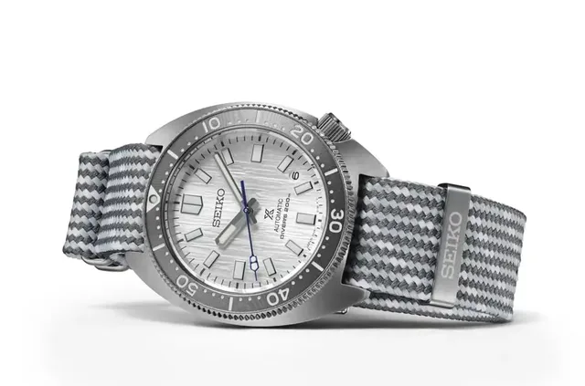 Ihre Farbgebung, Zifferblattstruktur und das im Lieferumfang enthaltene Flechtband sind inspiriert von der Struktur polaren Eises. Das Polyester für das Band, das in japanischer Seichu-Technik geflochten wird, stammt aus dem Recycling von Plastikflaschen. Laut Seiko sorgen die Flexibilität und Luftdurchlässigkeit der Flechtstruktur für den Tragekomfort.Das Gehäuse mit der Schraubkrone bei der Vier hat Seiko dem der Taucheruhr 6105-8000 aus dem Jahr 1968 entlehnt. Es besteht aus Edelstahl, das in einem Vakuum ionisiert wurde und so vor Gebrauchsspuren geschützt ist. Auch das zweite im Lieferumfang enthaltene Armband besteht aus Edelstahl und ist mit diesem sogenannten Super-Hard Coating behandelt. Der Gehäusedurchmesser liegt bei 41, die Höhe bei 12,3 Millimetern.
