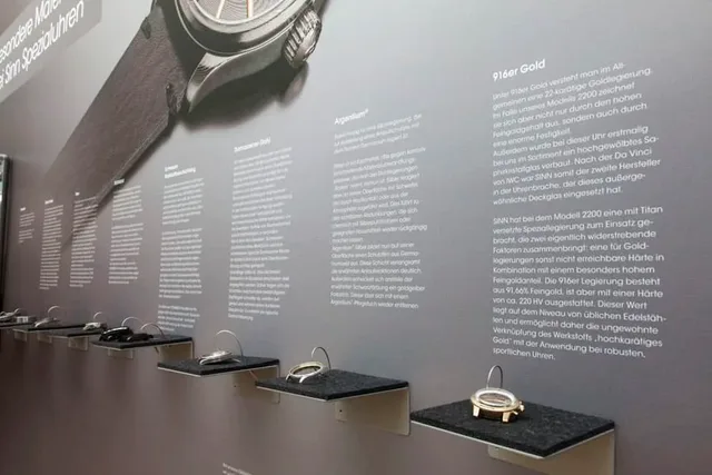 Darüber hinaus erfährt man alles Wissenswerte über die verschiedenen speziellen Sinn-Technologien, von der Tegimentierung, also Oberflächenhärtung, der Gehäuse und Bänder über die Temperaturresistenztechnologie bis zur Ar-Trockenhaltetechnik. Und an einer speziellen Wand kann man Gehäusematerialien wie Damaszenerstahl, Gold, Titan mit der Hand befühlen.