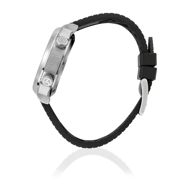 Ihr reichlich 40 Millimeter großes, sehr massives Gehäuse nimmt das Super-Compressor-Konzept mit den zwei typischen Kronen auf. Die obere bei zwei Uhr dient dem Einstellen des innenliegenden und nur gegen den Uhrzeigersinn drehbaren Tauchrings. Somit lässt sich auch die Krone nur in eine Richtung bewegen. Vollkommen richtig, denn sie ist nicht verschraubbar, und wäre sie in beide Richtungen drehbar, könnte sie sich samt Drehring versehentlich im Uhrzeigersinn verstellen und damit die Tauchzeit ungewollt verlängern.