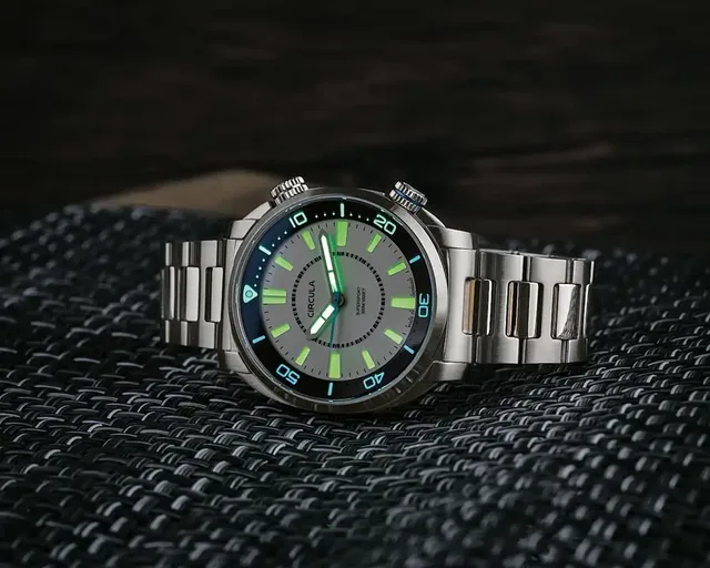 Das große, geriffelte Bedienelement nimmt mit den kreuzförmigen Einschnitten oben sogar das Markenzeichen der historischen Super-Compressoren auf. Die Krone bewegt den Tauchdrehring in Halbminutenschritten. Bemerkenswert ist zudem nicht nur seine komplette minutengenaue Skalierung, sondern dass diese sogar bei Dunkelheit leuchtet. Das sieht man in dieser Prägnanz wirklich selten. Verantwortlich dafür zeichnet die Superluminova C3, die zudem auf dem Sandwich-Zifferblatt in der relativ neuen Qualitätsstufe X1 zum Einsatz kommt. Laut Hersteller Tritec sind bei dieser die Farbpigmente leichter zu aktiveren und zeigen einen Anstieg in der Nachleuchtperformance um über 60 Prozent nach zwei Stunden im Dunkeln. Je länger man im Dunkeln bleibt, desto weniger schnell fällt das Nachleuchten im Vergleich zu bisherigen Pigmenten ab. Die Ablesbarkeit wird damit mindestens um den Faktor 1,6 verlängert.