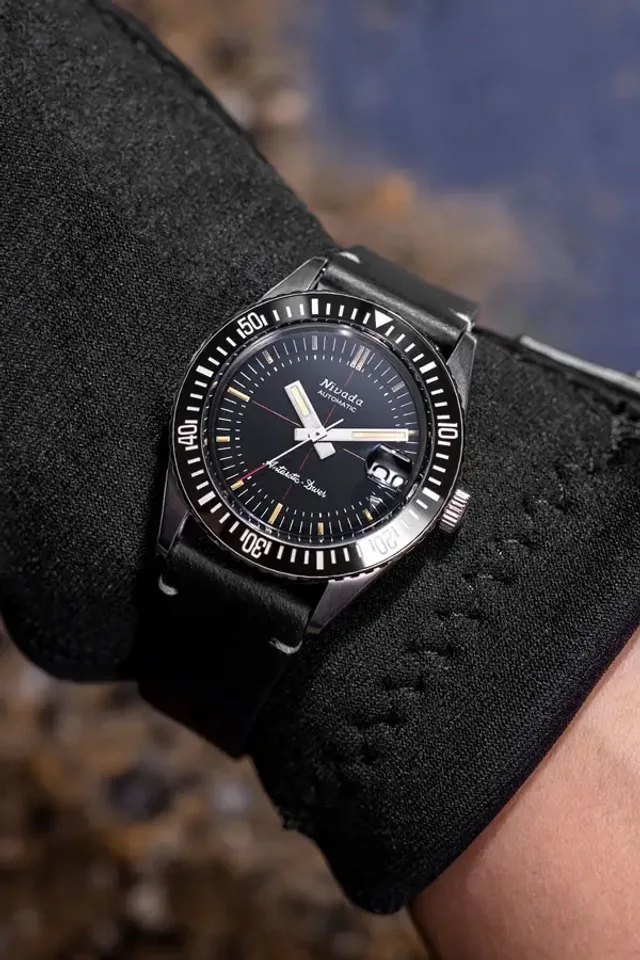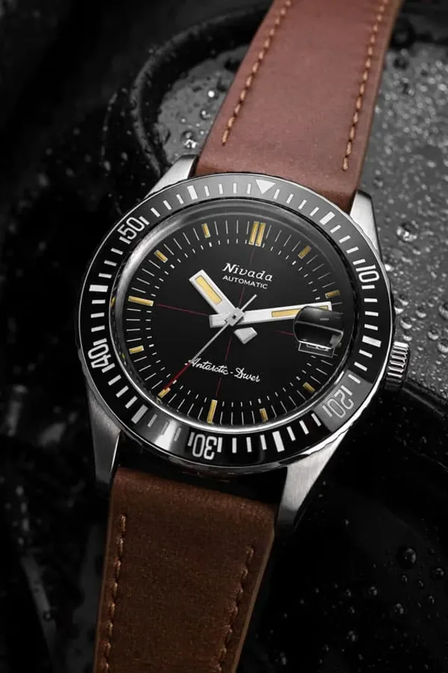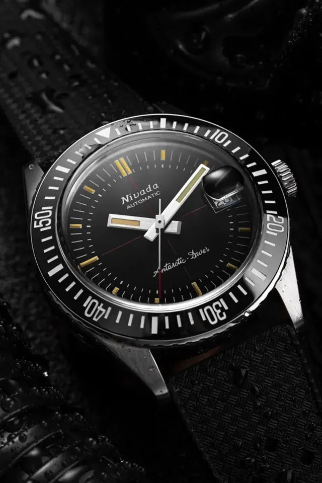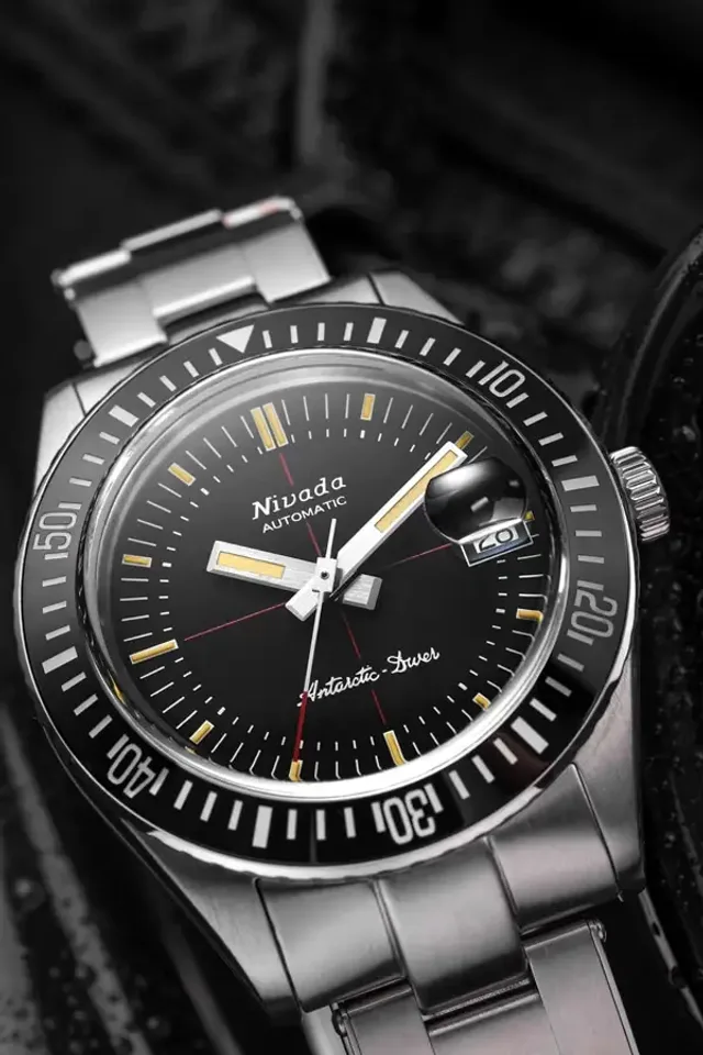 1950 erschien die Taucheruhr Antarctic, die erste wasserdichte Automatikuhr des Hauses. Fünf Jahre später gelangte sie im Rahmen der US-Navy-Operation Deep Freeze I an den Südpol, wo es galt, zwei Stationen und ein Flugfeld zu errichten. Seit 1961 gehört der Chronomaster zum Portfolio von Nivada Grenchen, ein Chronograph, der bis zu einem Druck von 20 Bar wasserdicht hält. 1964 folgt die bis zehn Bar wasserdichte Depthomatic mit Tiefenmesser.Mit ihrer markanten Keramiklünette und dem gewölbten Saphirglas über dem Zifferblatt stellt sich die neue Antarctic Diver optisch in die Tradition eben dieser Taucheruhren. Allerdings ist die Lünette in beide Richtungen drehbar, anders als für Taucheruhren empfohlen.