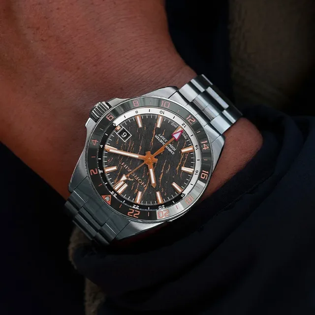 Die strukturierten Zifferblätter sind eine Hommage an die Berge des Himalayas. Die goldenen Risse auf dem anthrazitfarbenen Zifferblatt sind den zerklüfteten Gletscherspalten des Khumbu-Eisbruchs nachempfunden, der als gefährlichster Abschnitt bei der Besteigung des Mount Everest gilt. Als Basis dient der 41-mm-großen 316L-Edelstahluhr ein anthrazitfarbenes Zifferblatt mit einem moosgrauen Keramiklünetteneinsatz. Eine weitere Variante ist als 40-mm-Version in Schwarz erhältlich.