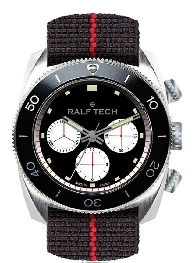 Bei der Serie WRV steht das V für Vintage, weil die Gehäuseform stärker an die Taucheruhren der Siebziger erinnern soll als die Serie WRX. Die neue WRV Barracuda mit dem Panda-Reverse-Zifferblatt besitzt ein 43,9 mm großes Edelstahlgehäuse mit polierten und satinierten Oberflächen, das bis 200 m wasserdicht ist. Indexe und Zeiger sind mit Superluminova belegt, Zeitmessung und Chronographenfunktion werden vom Grand-Seiko-Kaliber 8R48 gesteuert: Es besteht aus 292 Einzelteilen, zieht automatisch auf und bietet 50 Stunden Gangreserve. Die Uhr wird in Frankreich von Pequignet montiert und reguliert. Die auf 100 Stück limitierte Uhr kostet 3.900 Euro und ist über die Markenwebsite www.ralftech.com erhältlich. buc