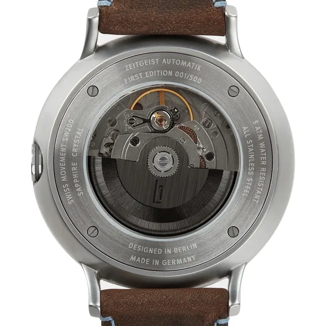 Im Falle der Zeitgeist Automatik kann der Besitzer das Werk mit seinem dunkel galvanisierten Rotor durch einen Mineralglasboden betrachten. Die Uhr gibt es mit verschiedensten Zifferblättern und Armbändern sowie mit einem blau oder schwarz beschichteten Gehäuse. Das Einsteigermodell misst 42,5 Millimeter im Durchmesser und nur zehn Millimeter in der Höhe.Lilienthal BerlinStargarder Straße 47D-10437 Berlinservice@lilienthal.berlin