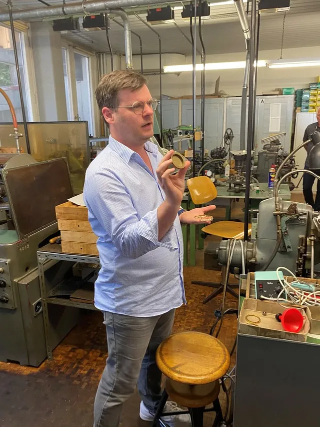 Simon Hall, Co-Geschäftsführer Hanhart, zeigt die Gehäusefertigung der Stoppuhren