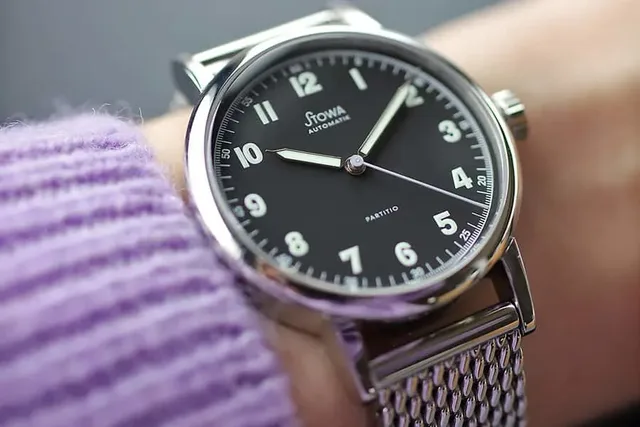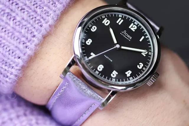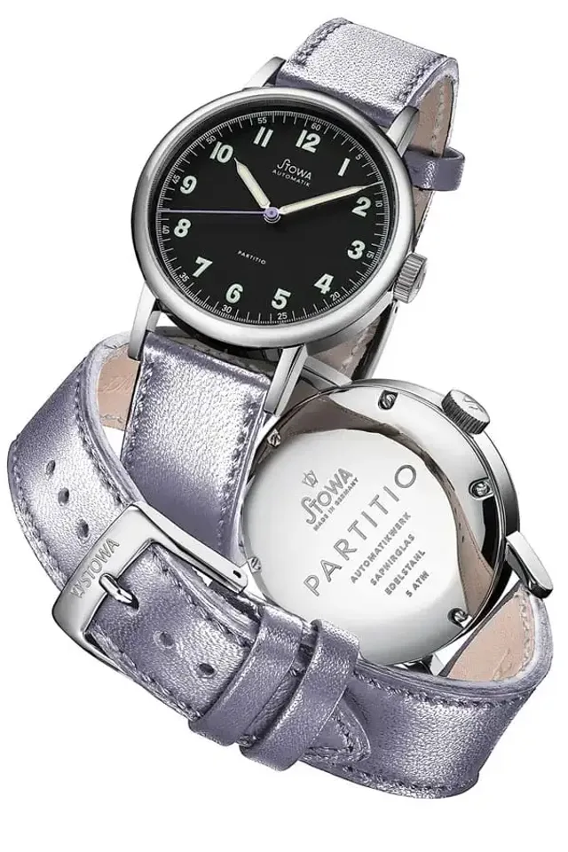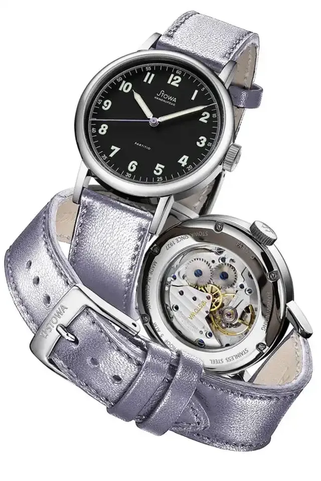 Das im Jahr 2008 entstandene Design der Partitio ist die Neuauflage einer historischen Stowa-Uhr aus den 1930er-Jahren. Die Form des Gehäuses, die Typographie der Ziffern und auch die Zeigerformen des Originals wurden fast unverändert übernommen und erhielten zeitgemäße Proportionen. Ebenfalls schon auf die historische Uhr gehen die Beschichtung von Ziffern und Zeigern mit Leuchtfarbe zurück. Im Falle der Partitio Lavender ist es Superluminova C3 auf den arabischen Ziffern sowie Stunden- und Minutenzeigern. Und ein weiteres Detail der historischen Uhr floss in die Gestaltung ein: Die feine Skalierung am Zifferblattrand, die jede Minute beziehungsweise Sekunde in weitere Bruchteile zerlegt. Daraus leitete sich der Name des Modells ab, denn das lateinische „Partitio“ bedeutet nichts anderes als „Teilung“.Mechanik für jeden Geschmack