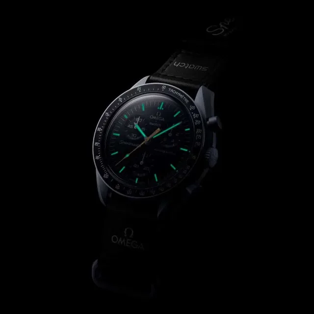 Die Stundenmarkierungen und Zeiger der Swatch x Omega MoonSwatch Mission to the Moon Moonshine Gold sind mit Leuchtmasse für gute Ablesbarkeit im Dunkeln beschichtet.