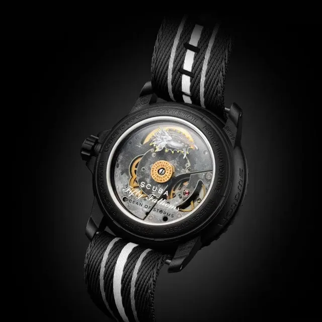 Das schwarze Gehäuse und die Krone bestehen aus Bioceramic. Das Gehäuse trägt auf der linken äußeren Seite das Wort „Swatch“. Das Zifferblatt hat einen schwarzen Sonnenschliff und eine Datumsanzeige zwischen 4 und 5 Uhr. Die Stunden-Indizes, die Stunden- und Minutenzeiger sowie die Skala auf der Lünette sind mit Superluminova versehen. Die einseitig drehbare schwarze Bioceramic-Lünette und das biobasierte Uhrglas sind mit einer kratzfesten Beschichtung behandelt. Das mechanische Sistem 51-Uhrwerk ist durch das transparente Saphirglas sichtbar und mit dem Schriftzug Ocean of Storms sowie einem Digitaldruck der Meeresschnecke Okenia Luna illustriert. Fünf motivierende Inschriften sind ebenfalls auf der Rückseite zu finden: Passion For Diving, Licence To Explore, Ocean Breath, Protect What You Love, Immerse Yourself. Das Nato-Armband besteht aus recycelten Fischernetzen. Die Dornschließe und Schlaufen sind ebenfalls aus Bioceramic gefertigt.