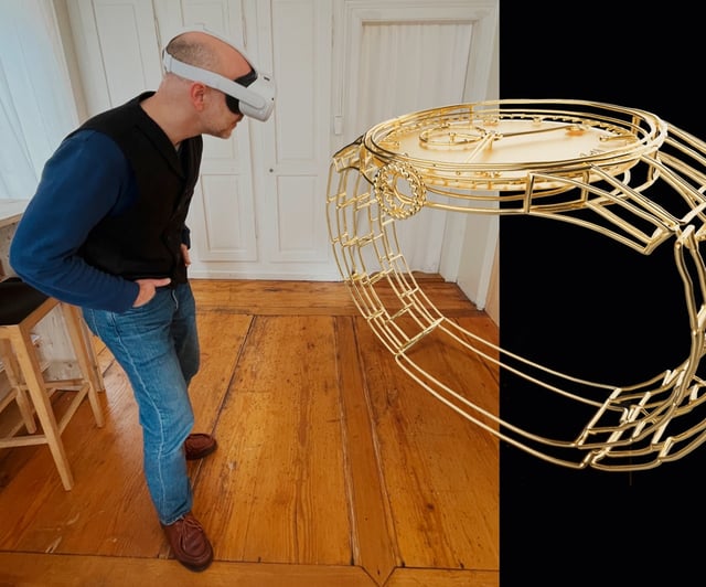 Eine andere NFT-Uhr von dir heißt „Continuum“. Sie besteht aus einem einzigen Faden, der Gehäuse und Band, Zifferblatt und Zeiger darstellt und immer weitergesponnen wird. Könnte man so eine Uhr auch in echt bauen?Im Prinzip schon. Man könnte das in 3D ausdrucken, dann hätte man so eine Art spinnwebenartiges Objekt. Aber diese Uhr besitzt ja gar kein Uhrwerk! Es gibt NFT-Uhren, die könnte man real bauen und andere nicht. Das ist das Spannende an diesem Projekt: Man sieht den Übergangsprozess vom Physischen hin zum Digitalen. Ich habe mich gefragt, was man als Uhr nicht machen kann. Eine dreidimensionale Uhr wie einen Kokon aufzubauen, aus einem einzigen, fortlaufenden Faden, das ist eigentlich nicht möglich. Nun gibt es die Uhr. Mich fasziniert der konzeptionelle Ansatz.Mit was für einem Programm hast du die Uhr gestaltet?Die Continuum habe ich mit einer VR-Brille direkt im virtuellen Raum gezeichnet. Der Prozess ist ähnlich wie am Bildschirm mit Maus und Tastatur, aber direkter, da man mit dem Controller in der Brille um das Objekt herumlaufen kann. Man kann sich das vorstellen wie die Arbeit an einer großen Skulptur aus Holz oder Stein. Die Software, die ich verwendet habe, heißt Gravity Sketch und wird hauptsächlich von Auto- und Produktdesignern verwendet.