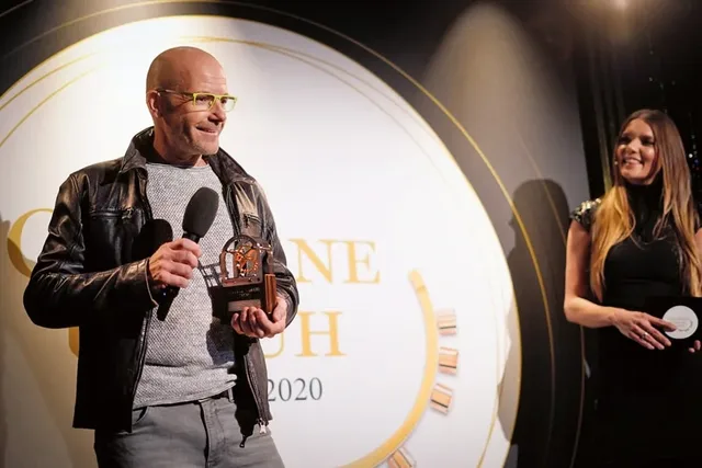 Stolz: Jörg Schauer mit der Goldenen Unruh 2020 für eine Stowa Fliegeruhr