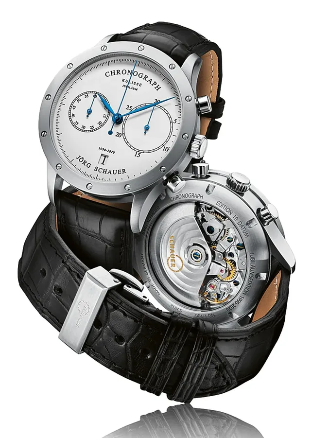 Damals in den 1990er-Jahren erlebte die mechanische Uhr ein Revival. Es gab große Börsen, auf denen auch Jörg Schauer unterwegs war und zahlreiche Sammler kennenlernte. Sie besaßen interessante Uhrwerke, unter anderem von Herstellern wie Rolex, Patek Philippe, Vacheron Constantin oder IWC, zum Teil mit Komplikationen wie ewigen Kalendern oder Minutenrepetitionen, mit oder ohne Zifferblätter. Und sie kamen auf Jörg Schauer zu, um sich Gehäuse bauen zu lassen. Diese hatten sie zuvor in den 1980er-Jahren, als die mechanische Uhr am Boden lag, einschmelzen lassen. So kam Jörg Schauer zum Uhrenbau, hat über 200 Zifferblätter entworfen, kleine Serien und mehr als 400 Unikate für seine Kunden geschaffen, ohne den Plan einer eigenen Uhrenmarke zu haben. Dass die mechanische Uhr eine Renaissance erleben würde, konnte sich Anfang der 1990er-Jahre keiner so recht vorstellen. Einerseits begann A. Lange & Söhne in Glashütte wieder Uhren zu bauen, andererseits wurden in Pforzheim noch immer Firmen zerschlagen. "Eine verrückte Zeit war das", erinnert sich Jörg Schauer. Aber zum Ende des Jahrzehnts hin wurde es schon schwieriger, Einzelteile, zum Beispiel Saphirgläser, Zifferblätter oder Kronen zu bekommen. Man musste größere Stückzahlen abnehmen und Jörg Schauer sich etwas einfallen lassen, was schließlich zur Serienfertigung unter seinem eigenen Namen führte. Er hatte zu diesem Zeitpunkt schon verschiedene Gehäuse entworfen, woraus das typische Schauer-Gehäuse mit den zwölf Schrauben auf der Lünette hervorging.
