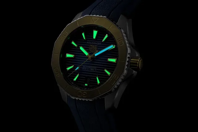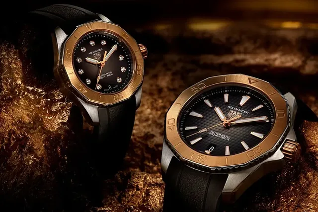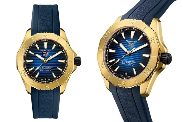 Die ab September 2023 erhältlichen 40-Millimeter-Modelle kommen erstmals mit Gehäusen und Lünetten aus massivem 18-karätigem Gold. Verfügbar sind zwei Versionen, eine mit Gehäuse und Lünette aus massivem 18-karätigem 5N Roségold, die andere aus massivem 18-karätigem 3N-Gelbgold. Ihre Sportlichkeit büßt die Uhr in keiner Weise ein, dafür sorgen eine schwarz DLC-beschichtete verschraubte Stahlkrone und der ebenso DLC-Gehäuseboden aus Titan Grad 2, in den die TAG Heuer-Ingenieure einen Saphirglasboden eingesetzt haben, der den Blick auf das neue Uhrwerk freigibt. Beide Uhren sind bis 200 Meter wasserdicht.Die beiden Modelle der TAG Heuer Aquaracer Professional 200 sind mit Zifferblättern mit Farbverlauf ausgestattet. Das Modell aus Roségold hat ein schwarzes Zifferblatt, das in ein bronzefarbenes, graues Zentrum übergeht. Die Gelbgoldvariante hat ein blaues, in der Mitte schimmerndes, Zifferblatt.