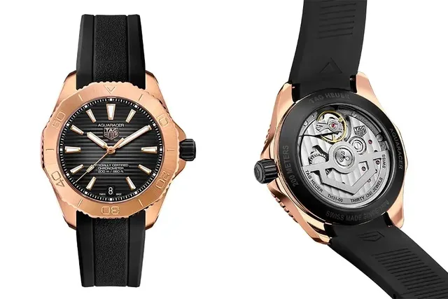 Die beiden Vollgoldmodelle der TAG Heuer Aquaracer Professional 200 sind mit einem neuen automatischen Manufakturwerk ausgestattet. Das Kaliber TH31-00 wurde von TAG Heuer und AMT, einer Schweizer Manufaktur für hochwertige Uhrwerke mit Sitz in La Chaux-de-Fonds, mitentwickelt. AMT produziert und montiert dieses Hochleistungswerk exklusiv für TAG Heuer.Das Kaliber TH31-00 gilt als hochpräzise und verfügt über eine Chronometerzertifizierung, die eine Ganggenauigkeit von -4/+6 Sekunden pro Tag verlangt. Außerdem bietet es eine Gangreserve von 80 Stunden - die höchste, die jemals in einer TAG Heuer Aquaracer mit mechanischem Uhrwerk erreicht wurde.Auch optisch besticht das Werk: Die Brücken des Uhrwerks mit 30 Steinen sind mit dem traditionellen Genfer Schliff verziert. Die Schwungmasse hat ein neues Design, das an das TAG Heuer-Wappen erinnert. Preislich liegen die Referenzen WBP5150.FT6199 (schwarz/rosé) und WBP5152.FT6210 (blau/gold) bei 18.650 Euro.