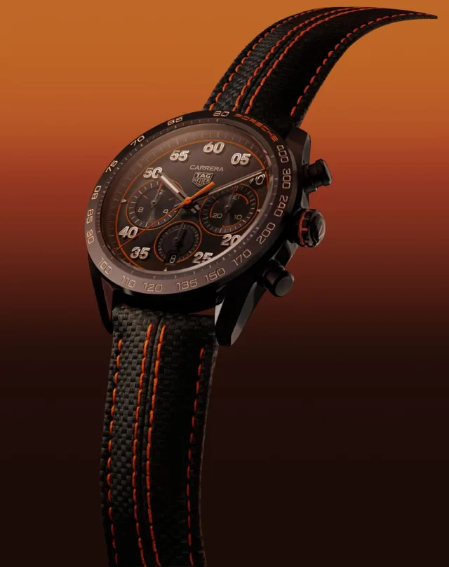 Nach zwei Modellen mit dezenten roten beziehungsweise gelben Akzenten bringen die Partner TAG Heuer und Porsche nun eine Variante mit auffälligen orangefarbenen Elementen. Als Inspiration für die Farbwahl dienten die Hitzefunken, die Rennautos auf dem Asphalt erzeugen.