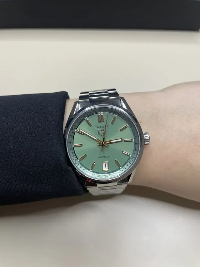 So sieht die grüne Carrera Date am Handgelenk aus