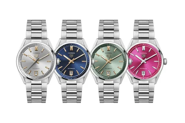 Die neue Carrera Date kommt in einer lebhaften Farbpalette mit vier Farben: Blau, Grün, Silber und Pink. Die Varianten in brillantem Signature-Blau, zartem Pastellgrün sowie in Silber kommen mit gebürstetem Sonnenstrahl-Effekt und veredelten Indexen aus 18K 5N Roségold ab April.Das Modell in Pink wird ab Mai mit rhodinierten, applizierten Indexen erhältlich sein. Ein Datumsfenster sitzt bei sechs Uhr. Aber nicht nur die Zifferblätter wurden neu durchdacht, das Design ist insgesamt schlanker und ergonomischer.