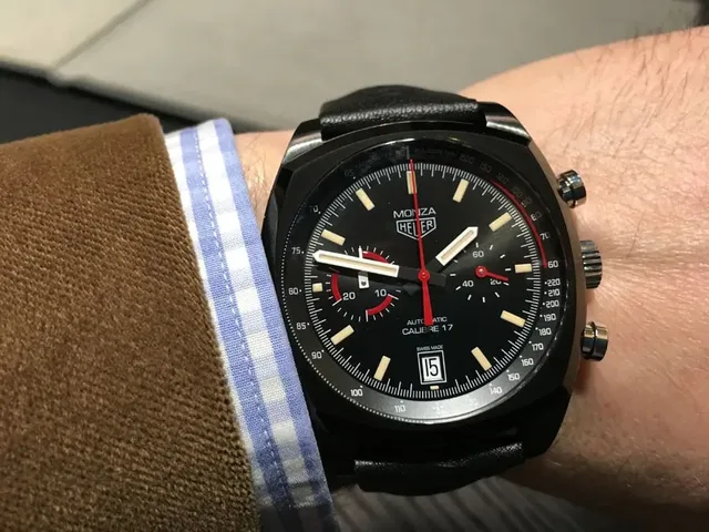 Gemäß der strengen Limitierung gibt es diese Monza-Modelle nur selten auf dem Gebrauchtmarkt. Das Investment liegt hierbei in einem Bereich ab 4.000 Euro.TAG Heuer Monza Calibre 17Zum 40. Geburtstag der Monza im Jahr 2016 stellte TAG Heuer ein neues Modell vor. Der Chronograph übernahm Elemente vorheriger Modelle - Zifferblatt und Optik lehnen sich stark an die 1970er-Jahre an. Das Gehäuse zitiert mit seiner schwarzen Farbe die Ur-Monza von 1976, besteht aber aus dem Leichtmetall Titan mit Titancarbidbeschichtung. Das Zifferblatt zeigt die originalen Schriftzüge. Leuchtmasse, Pulsmesser und Tachymeterskala stehen für Sportlichkeit.