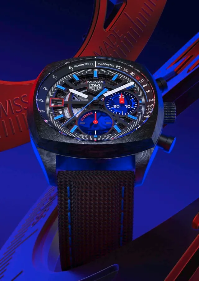 Nachdem TAG Heuer für mehrere Jahre keine neuen Monza-Modelle mehr lancierte, bringt die Schweizer Manufaktur den Chronographen 2023 wieder zurück. Die neue Monza kommt mit dem klassischen kissenförmigen Gehäuse in einer modernen Aufmachung. Wie das erste Modell von 1975 ist das Gehäuse der Neuheit schwarz. Es besteht jedoch aus dem modernen Werkstoff Carbon. Unter dem skelettierten Zifferblatt mit blauen Saphirgläsern für Stoppminuten und kleine Sekunde tickt das hauseigenen Calibre Heuer 02 Flyback, das ein Chronometerzertifikat der COSC besitzt. Mit der blauen Pulsometerskala im ersten Viertel kann man seinen Puls messen: 15 Schläge mit dem Chronograph stoppen und dann den Puls zwischen 60 und 200 Schläge pro Minute ablesen.