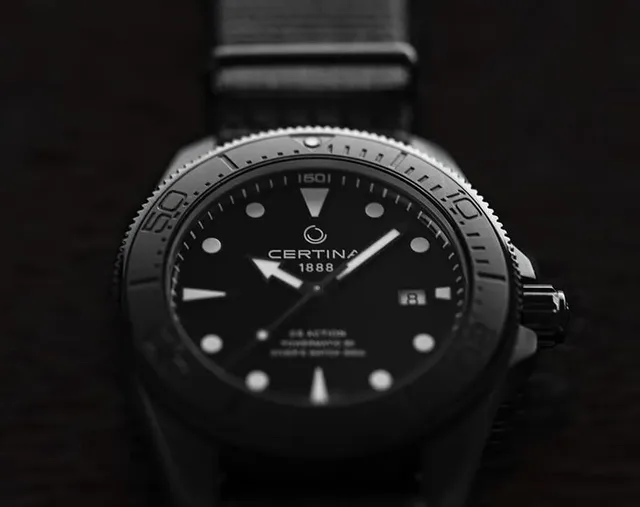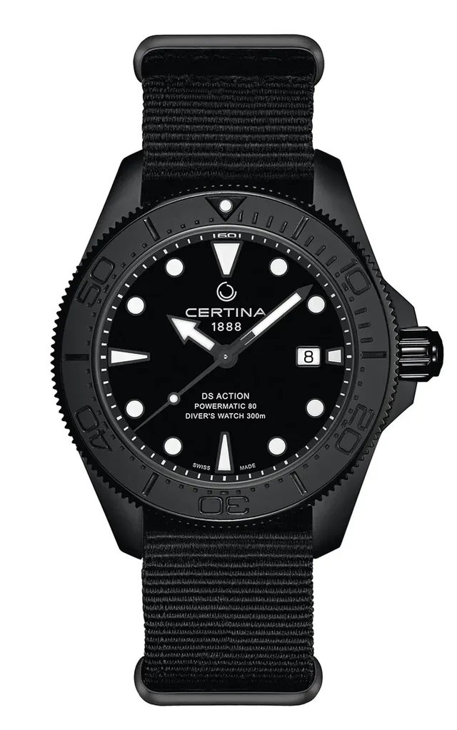 Sie holt die Dunkelheit der Meerestiefen an die Oberfläche: Die neue DS Action Diver 43 mm von Certina kleidet sich komplett in Schwarz. Tiefe besitzt sie ohnehin. Als legitime Taucheruhr ist sie bis 300 Meter wasserdicht und bestens für jedes Abenteuer gerüstet – an Land wie unter Wasser. Ein schwarzes Stahlgehäuse, die Drehlünette mit matter Keramik und ein dunkles NATO-Band machen sie zudem zu einem echten Stil-Statement.
