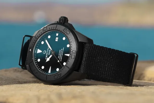 Ihr Ring aus mattschwarzer Keramik bildet den perfekten Hintergrund für eine Tauchzeit-Skala, deren Ziffern mit Lack ergänzt wurden. Das Edelstahlgehäuse von 43 Millimeter Durchmesser ist dank PVD-Beschichtung farblich abgestimmt. Das schwarze Textilband im NATO-Look ist aus #tide ocean material gefertigt, das ebenfalls einen klaren Bezug zum Meer hat. Dieses nachhaltige Material entsteht auf Basis von Kunststoffen, die aus dem Ozean gefischt wurden. Gehalten wird es von einer Dornschliesse mit schwarzer PVD-Beschichtung.Weitere Informationen erhalten Sie unter: www.certina.com