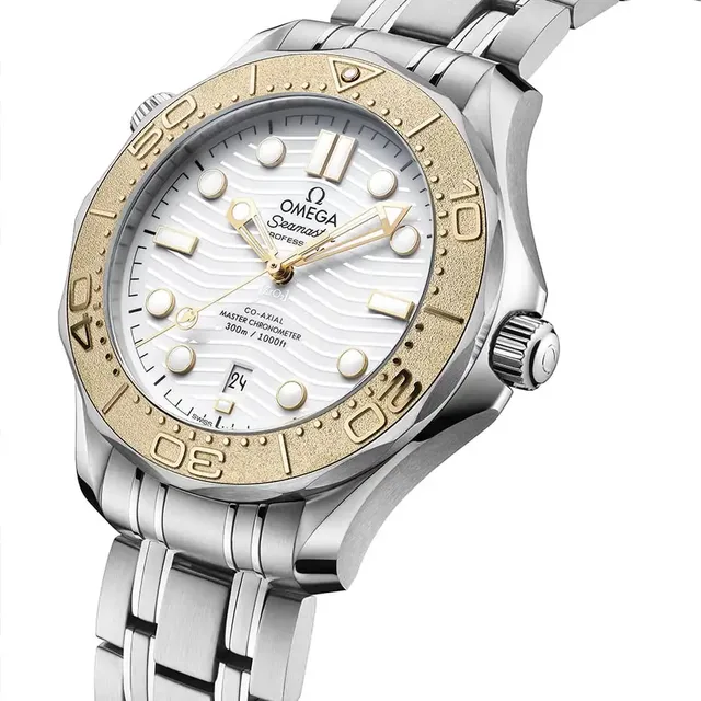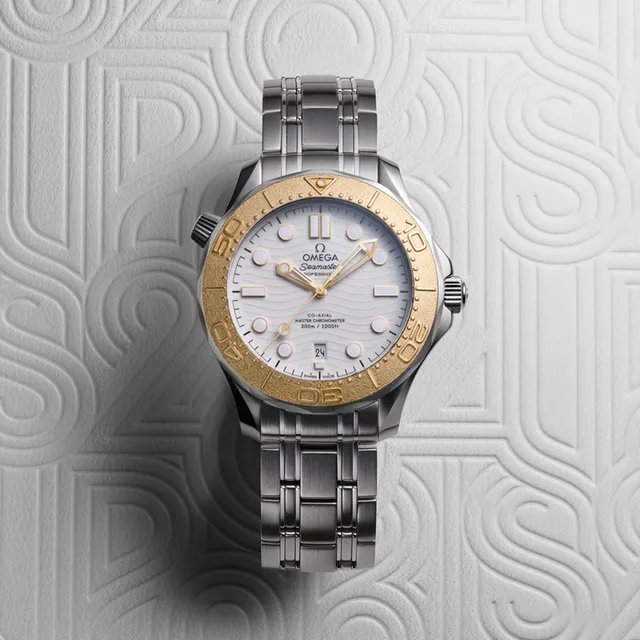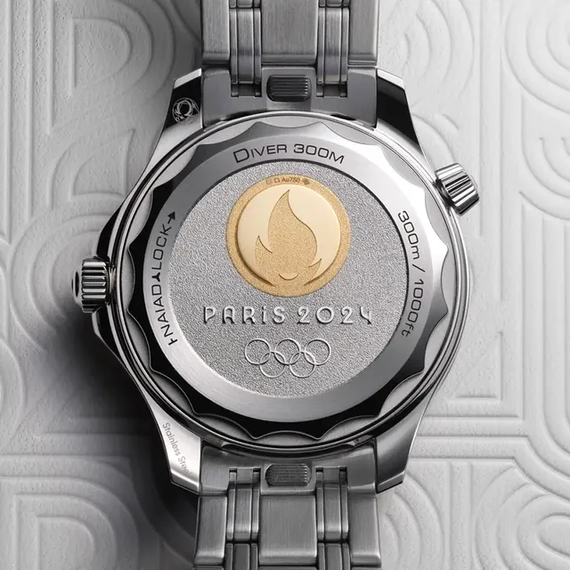 Das 42-Millimeter-Modell wird erstmals nur in den Omega Boutiquen in Paris erhältlich sein. Das Edelstahlgehäuse wird von einer Lünette aus Omegas eigener 18k Gelbgoldlegierung namens Moonshine Gold umrahmt, als Symbol an die begehrte erste Medaillen, die die Athlet:innnen gewinnen möchten. Eine lasergravierte Taucherskala im positiven Relief samt mit Superluminova beschichtetem Punkt bei 12 Uhr sorgt für extra Struktur.