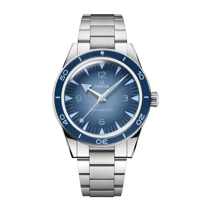 Mit ihrer charakteristischen Tauchskala, den skelettierten Zeigern, den markanten, erhabenen Indizes und dem Heliumauslassventil ist die Diver 300M, die 1993 auf den Markt kam, für Tiefseeabenteurer gemacht. Die 42 mm-grosse Seamaster Diver 300M aus Edelstahl ist mit einem passenden Armband oder einem blauen Kautschukband erhältlich. Das blau lackierte Keramikzifferblatt mit Farbverlauf und Wellenmuster wird von einer blauen Keramiklünette mit Tauchskala aus Email ungeben. Das Zifferblatt wird mit rhodinierten, skelettierten Zeigern und Indizes in hellblauem SuperLumiNova gefüllt. Hier sorgt das Omega Co-Axial Master Chronometer Kaliber 8800 für Funktion. Das Modell Stahl mit Kautschukband, Referenz 210.32.42.20.03.002, gibt es für 6.300 Euro.(Kostenloser Download: die Seamaster Diver 300 im Test)
