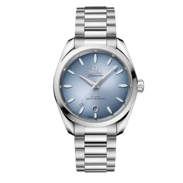 Die 2002 präsentierte Seamaster Aqua Terra erinnert mit ihrem zurückhaltenden Zifferblatt an die klaren Linien der originalen Seamaster 300 von 1957. Im Laufe der Jahre ließ Omega immer wieder vom Meer inspirierte Elemente einfließen, darunter Zifferblätter mit Teakholzmuster in Anlehnung an Decks von Luxusjachten und Indizes in Form von Segelbooten. Die Aqua Terra Kollektion von Omega umfasst heute drei neue Modelle mit symmetrischen Gehäusen und Kronen aus Edelstahl. Das Zifferblatt ist jeweils in "Summer Blue" mit Farbverlauf und Sonnenschliff gehalten, die rhodinierten Zeiger und Indizes sind mit hellblauer Superluminova gefüllt. Die Uhr ist bis 150 Meter wasserdicht. Die 38 mm-Version mit dem Omega Co-Axial Master Chronometer 8800 besitzt ein poliertes und gebürstetes Armband mit abgerundeten Gliedern und Indizes in Form von Segelbooten.