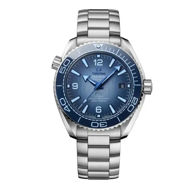 In Anlehnung an die Seamaster 300 wurde die Planet Ocean im Jahr 2005 mit einer orangefarbenen Lünette und dem charakteristischen Heliumauslassventil eingeführt. Die Uhr enthielt zudem Omegas berühmte Co-Axial Hemmung, die erstmals im Kaliber 2500 zum Einsatz kam. Die neue Seamaster Planet Ocean 600M ist im Meer zu Hause und leistet bis in 600 Metern Tiefe ihre Dienste. Eine blaue Keramiklünette mit hellblauer Tauchskala aus Email umgibt das PVD-beschichtete Keramikzifferblatt, welches im Farbverlauf lackiert ist. Die gebläuten Zeiger und Indizes sind mit hellblauer Superluminova gefüllt. Dieses 39,5 mm grosse Modell wird vom Co-Axial Master Chronometer 8800 angetrieben und verfügt über ein Gehäuse und ein Armband aus Edelstahl. Das Modell am Stahlband, Referenz 215.30.40.20.03.002 schlägt mit 7.900 Euro zu Buche.