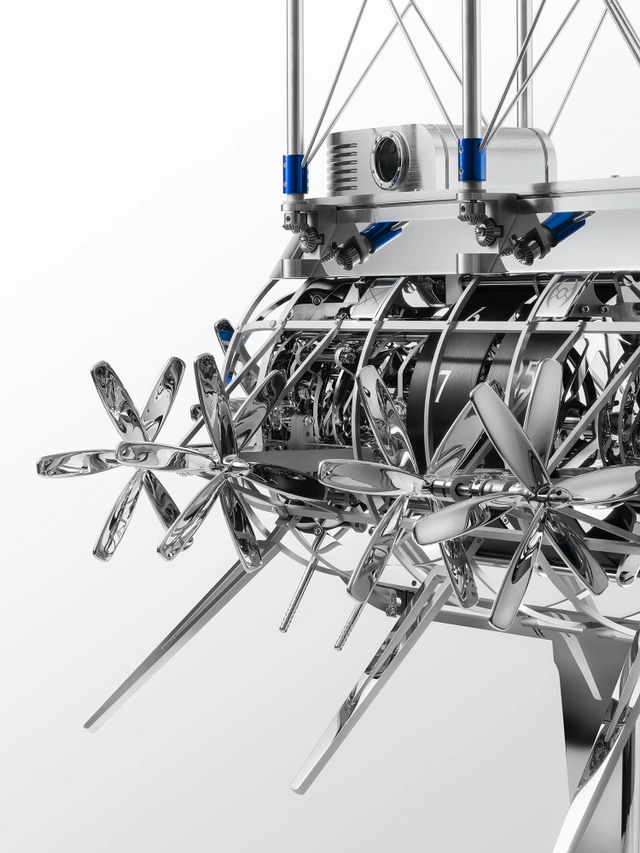 Wenn die Uhr die Stunden schlägt, setzt sich das Flugobjekt in Bewegung und bereitet sich mit seinen 32 rotierenden Propellern, die etwa sieben Sekunden lang wirbeln, auf den Start vor. Im Inneren befinden sich zwei Uhrwerke und zwei Aufzugssysteme: Das eine treibt dank zweier separater Federhäuser die Uhrzeit und den Stundenschlag an, während das andere, von einem dritten Federhaus gespeist, die Energie für die Propeller liefert. Das erste wird von Hand über die Propeller an der Vorderseite der Flugmaschine aufgezogen: im Uhrzeigersinn für den Stundenschlag und gegen den Uhrzeigersinn für die Uhrzeit. Die Propeller auf der Rückseite ziehen den Automaten auf. Die Gangreserve der Uhr beträgt durchschnittlich acht Tage – unabhängig davon, ob das Läutwerk ein- oder ausgeschaltet ist – und die des Automaten.