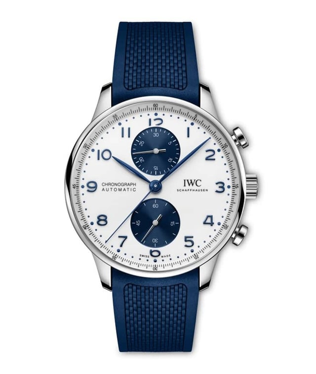 Die IWC Portugieser Chronograph mit weißem Zifferblatt und blauen Totalisatoren hat Pilzdrücker © IWC