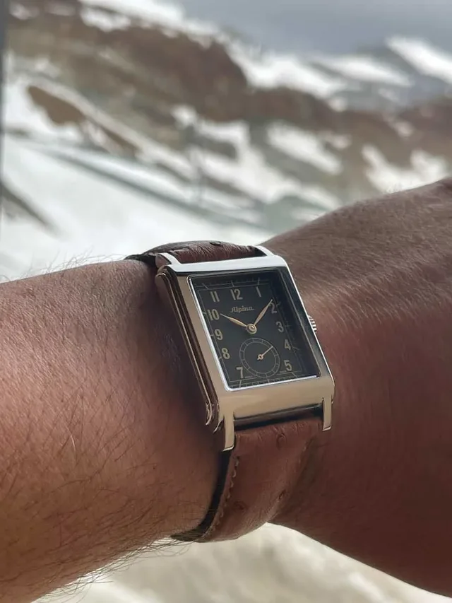 Wir hatten bei der Jubiläumsfeier von Alpina nahe dem Matterhorn die Gelegenheit, uns das Modell anzusehen. Die Uhr hat nicht nur ein gelungenes Retro-Design, sondern ist für den Preis ausgezeichnet verarbeitet. Sie ist recht flach und liegt angenehm am Arm. Durch das rechteckige Gehäuse wirkt die Größe dezent.