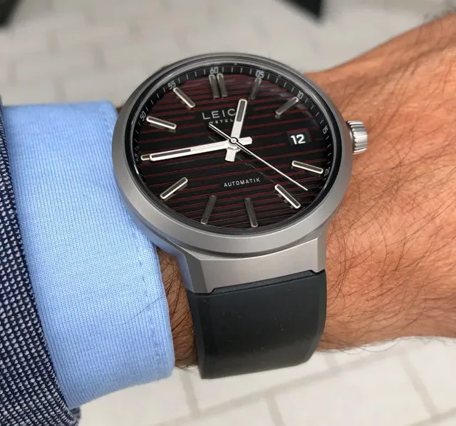 Bei der Präsentation in den Leitz Werkstätten im hessischen Wetzlar konnten wir uns von der hohen Qualität aller Komponenten überzeugen. Besonders hat uns die Zifferblattkonstruktion gefallen: Die zwei nur 0,4 Millimeter dicken Lagen, von denen die obere im Ätzverfahren mit Rillen versehen wird, bieten vielfältige Gestaltungsmöglichkeiten: Besonders ideenreich präsentiert sich die Lauch Edition mit zwei schwarzen Zifferblättern, aber rot lackierten Innenkanten der oberen Lage. Das Rot wird erst sichtbar, wenn man das Handgelenk dreht.