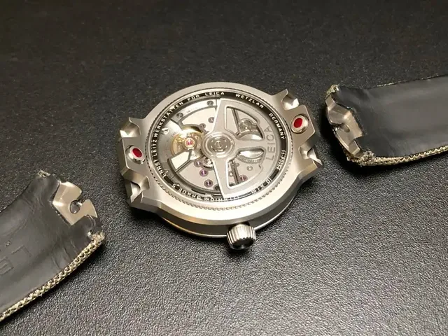 Das Automatikkaliber mit speziell gestalteten Brücken liefert Chronode zu. Der Bandwechsel geht dank Leica-rotem Drücker leicht vonstatten