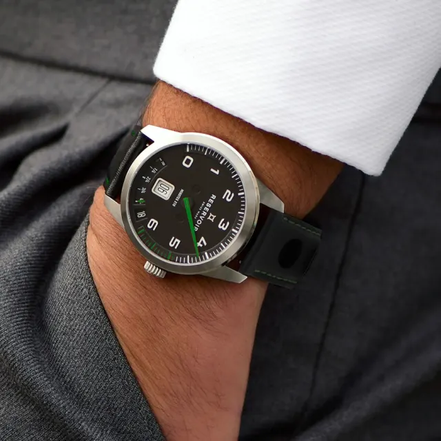 Grüne Akzente treten auf dem schwarzen Zifferblatt der Reservoir GT Spring Lab hervor