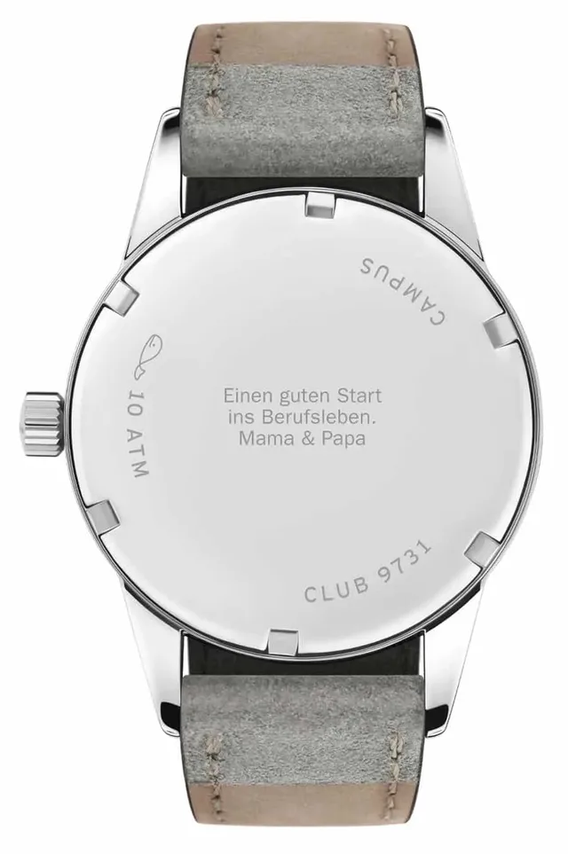 Der Boden bietet Platz für Gravuren – gute Wünsche zum Schulabschluss, zum Start ins Leben, Weisheiten, Ermahnungen, Versprechen... so ist es zumindest von Nomos Glashütte gedacht – das Ganze – je nach Modell – für 1.300 Euro (36 mm) beziehungsweise 1.400 Euro (38 mm). MaRiLesen Sie weiter:Montblanc: 1858 Iced Sea Grey DialFrederique Constant: Classic Tourbillon Manufacture