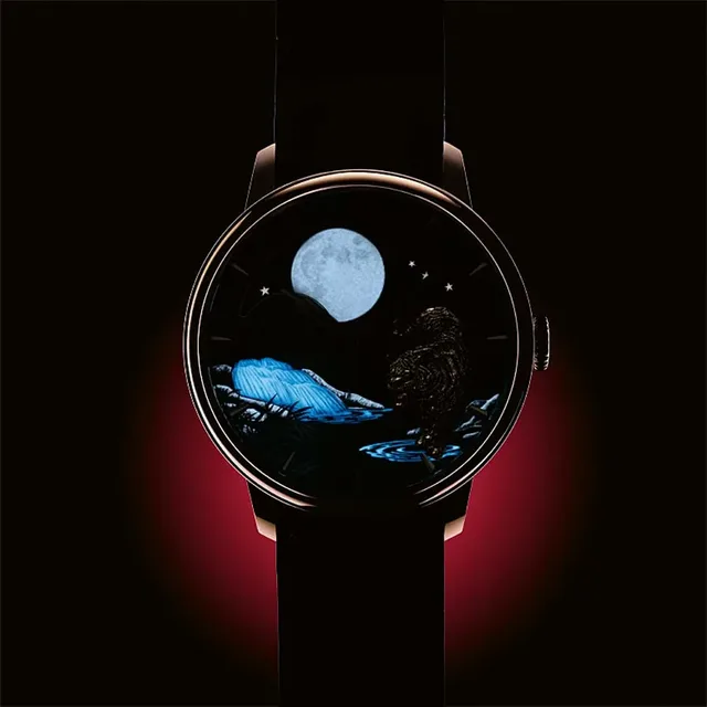Im Dunkeln beleuchtet er die Szene buchstäblich, denn die aus Perlmutt gefertigte Scheibe ist mit Superluminova belegt. Die Anzeige ist übrigens astronomisch genau und weicht erst nach 122 Jahren einen Tag ab. Während die obere Hälfte des Zifferblatts von den leuchtenden Nachtgestirnen dominiert wird, steht die untere ganz im Zeichen der kleinen, aber umso beeindruckenderen Tigerskulptur. Die Raubkatze, die auf nächtlichem Beutezug unterwegs ist, wird inmitten einer handgemalten und mit kleinen Leuchtpigmenten besprenkelten Wasserfall-Landschaft dargestellt. sz