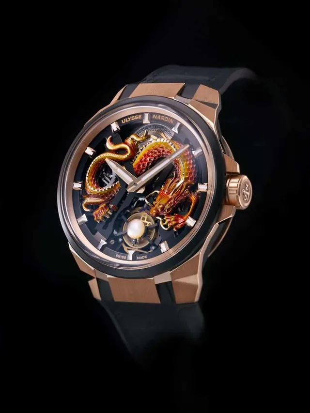 Die Uhr zeigt einen fein gearbeiteten Drachen aus 5N Roségold, der eine Skelettstruktur in Form eines X umringt, als wäre er gerade aus dem Uhrwerk entstanden. Im Mittelpunkt, geschützt von den Klauen des Drachens, sitzt eine Perle auf dem fliegenden Tourbillonkäfig - die Darstellung von fünf Krallen hat dabei eine besondere Bedeutung: Fünfkrallige Drachen stehen traditionell für höchstes Ansehen.Hier zeigen wir eine andere kunstvolle Drachenuhr. Schon 2012 widmete Ulysse Nardin das letzte Jahr des Drachens mit einem limitierten Email-Modell. Dieses Mal hat die Marke jedoch einen dreidimensionalen Drachen geschaffen, der um das Uhrwerk herum zum Leben erwacht. Dies benötigte einen zweijährigen Entwicklungsprozess und Änderungen am Gehäuse, der Lünette und dem gewölbten Saphirglas.
