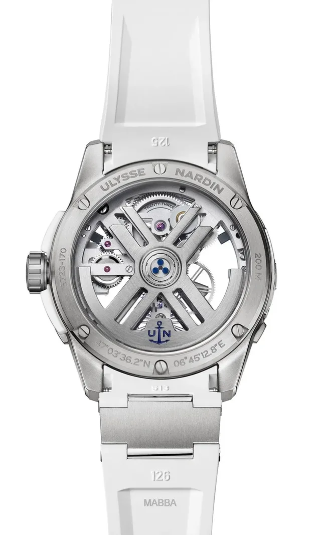 Das in Form eines X skelettierte Automatikwerk UN-372 mit großer Silizium-Unruh bildet das technische und optische Highlight der bis 20 Bar druckfesten Luxustaucheruhr X Skeleton White. Aus diesem Material, das die Schweizer Manufaktur einst in die Welt der Uhren einführte, bestehen auch das Hemmungsrad, der Anker und die Spiralfeder.