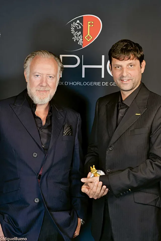 Preisgekrönt: Urwerk hat beim Grand Prix d’Horlogerie de Genève 2019 für das Projekt AMC den neuen "Prix de l’Audace", den Preis der Kühnheit bekommen. Martin Frei (links) und Felix Baumgartner (rechts) © PR