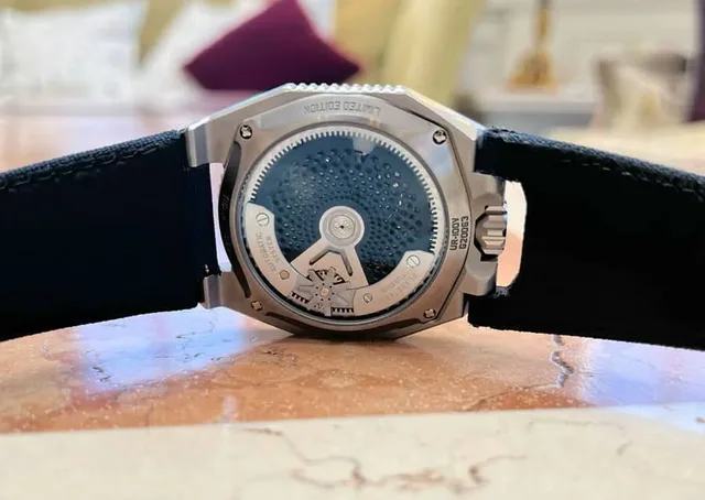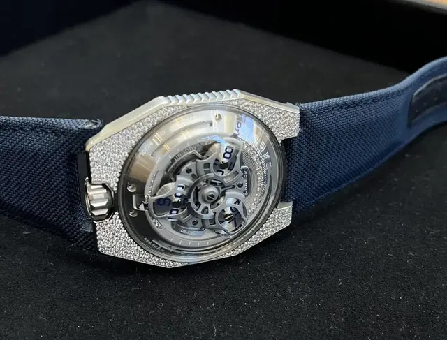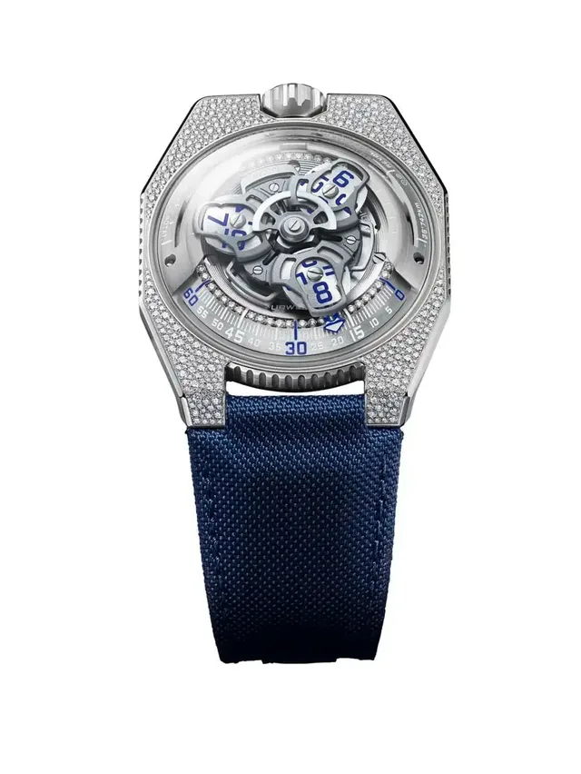 Die UR100-V Stardust ist bis 30 m wasserdicht und wird mit einem blauen Stoffband am Arm gehalten. Urwerk baut pro Jahr nur 10 Exemplare, der Preis beträgt 88.000 Schweizer Franken zuzüglich Steuern. bucEin weiteres Beispiel für eine Urwerk UR-100 V finden Sie HIER.