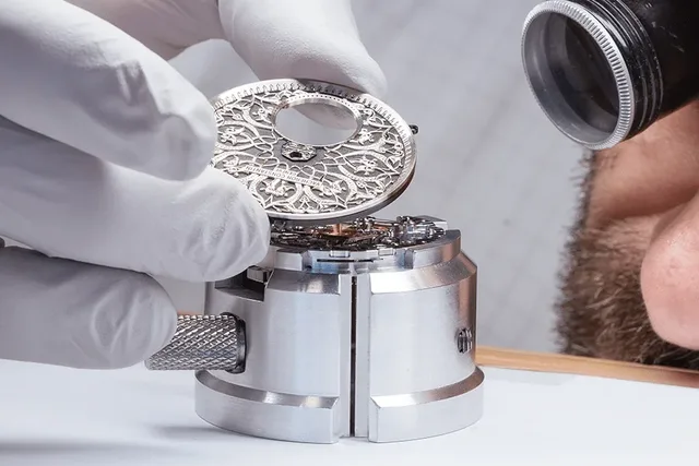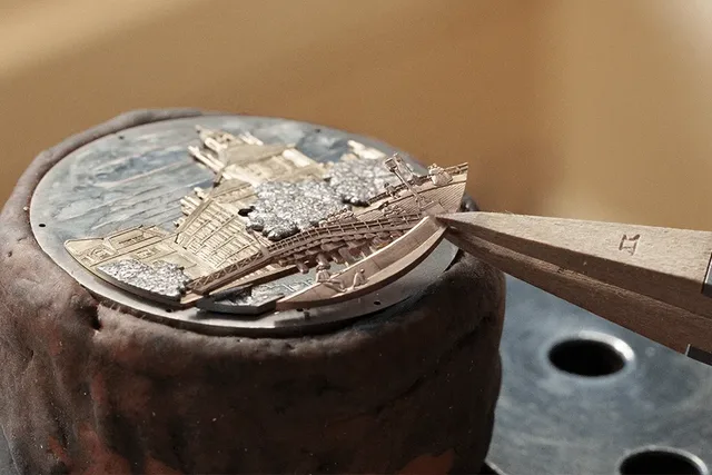 Das Motiv im handgravierten Gehäuse aus 18-karätigem Weißgold mit 44 mm Durchmesser ahmt die Arabesken und floralen Muster der Großen Scheich-Zayed-Moschee in Abu Dhabi nach. Der Graveur hat diese organischen Voluten mit einer Liniengravur auf den verschiedenen Gehäuseteilen nachgebildet, während er sich auf dem Höhenring für ein eher geometrisches Muster entschieden hat. Diese Intaglio-Gravur wird mit einem Stichel auf den mit einer Kaltnadel gespurten Canvas aufgetragen. Weiter für Kontraste sorgt auch das dunkle Zifferblatt, dass mit einer durchbrochenen und gravierten „Spitzenabdeckung“ aus Weißgold verziert ist. Die Uhr kommt an einem Alligatorlederarmband mit Faltschließe aus Weißgold.