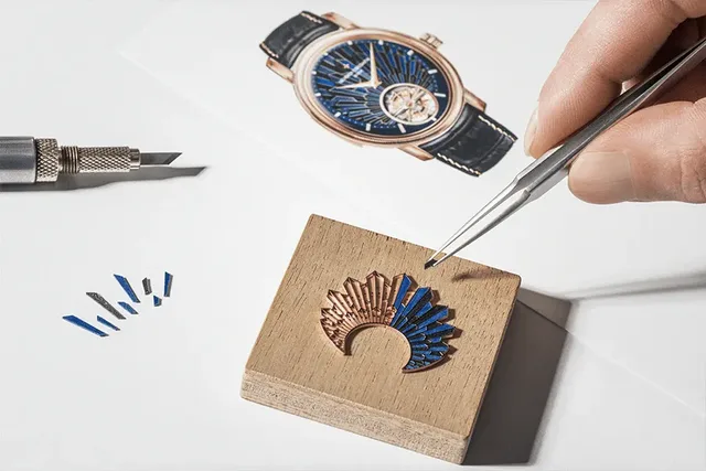 Dagegen erinnert das Modell aus Roségold an ein beliebtes Wahrzeichen von New York. Ab den 1920er Jahren begann Manhattan mit Wolkenkratzern im Art-déco-Stil zu wachsen. Das zwischen 1928 und 1930 errichtete Chrysler Building war mit 319 Metern das höchste Gebäude der Welt und ist nach wie vor für seine terrassenförmige Krone aus sieben mit silbernem Metall verkleideten Bögen bekannt.Die Uhr Les Cabinotiers Minutenrepetition Tourbillon – Hommage an den Art-déco-Stil ahmt diese einzigartige architektonische Pracht mit Holzeinlegearbeiten nach, die in diesem Fall von der Cloisonné-Emaillierung inspiriert sind. Der obere, flache Teil des Zifferblatts ist mit einem Strahlenmotiv versehen. Zum ersten Mal hat Vacheron Constantin ein Zifferblatt mit einer Kombination aus Holzintarsien und Champlevé-Emaillierung hergestellt. Der Intarsien-Spezialist benötigte einen ganzen Monat, um dieses Werk aus Metall und Holz zu schaffen, das die glänzende Spitze des Chrysler-Gebäudes und die Holzintarsien in den Aufzügen aufgreift. Dazu weist das Zifferblatt eine Perlenminuterie auf, die von 11 facettierten Diamantindizes markiert ist und die mit zunehmender Annäherung an 12 Uhr immer schmaler werden, um die Fluchtlinie zu akzentuieren. Das Gehäuse des Modells aus 18-karätigem 5N Roségold ist vollständig mit Fischgrätenmotiven graviert, die mit der Technik der Liniengravur auf dem Gehäusemittelteil, den Bandanstößen und der Lünette geschaffen wurden. Das 44-mm-Gehäuse aus 18-karätigem Roségold mit einer Höhe von 13,5 mm ist mit einem Armband aus Alligatorleder ausgestattet.