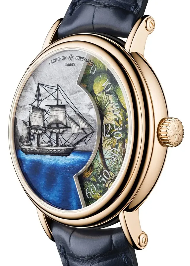 Bei der Métiers d’Art Hommage an Naturforscher und Entdecker Magellanstraße geht es um die Durchquerung des berühmten Seewegs. In der abgelegenen Region entdeckten die Naturforscher eine üppige Vegetation, in der sich Palmblätter und Farne abwechselten, die auf dem unteren Teil des Zifferblatts wachsen. Die Farben wurden von den Emailleuren in mehreren Brennvorgängenmit großer Sorgfalt hergestellt, um die bestmögliche Übereinstimmung mit dem Ton des Roségolds zugewährleisten, aus dem das Gehäuse besteht. Der obere Teil des Zifferblatts ist mit einer feinenWeißgoldgravur verziert, welche die Beagle auf blau emaillierten Wellen zeigt.